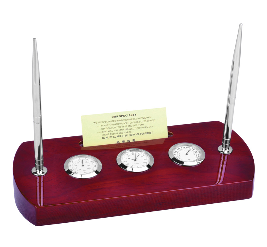 Includes a clock, a thermometer, a hygrometer, two ballpoint pens, and business card holder.