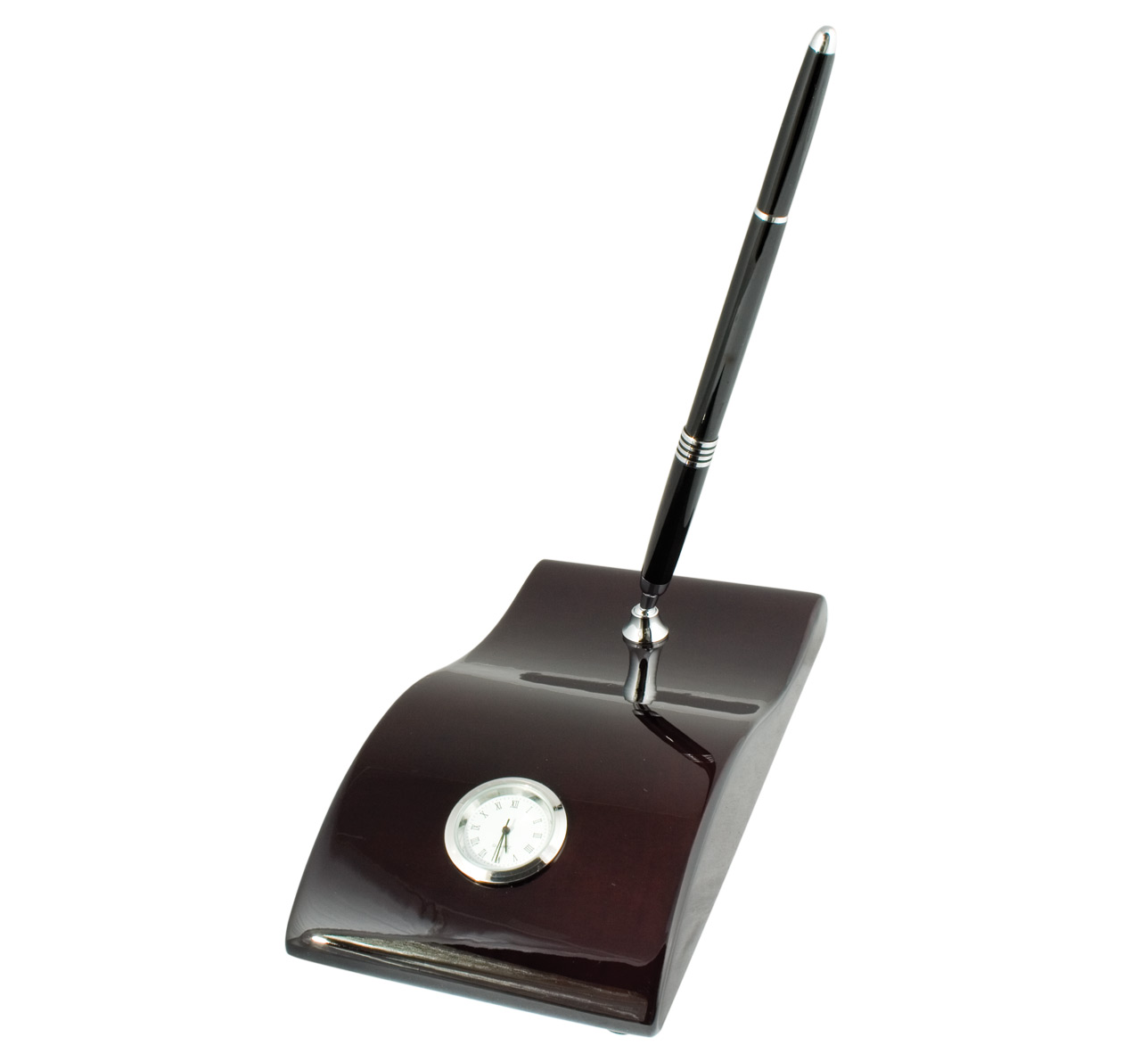 Luxury single pen desk stand. Includes a clock and a ballpoint pen.