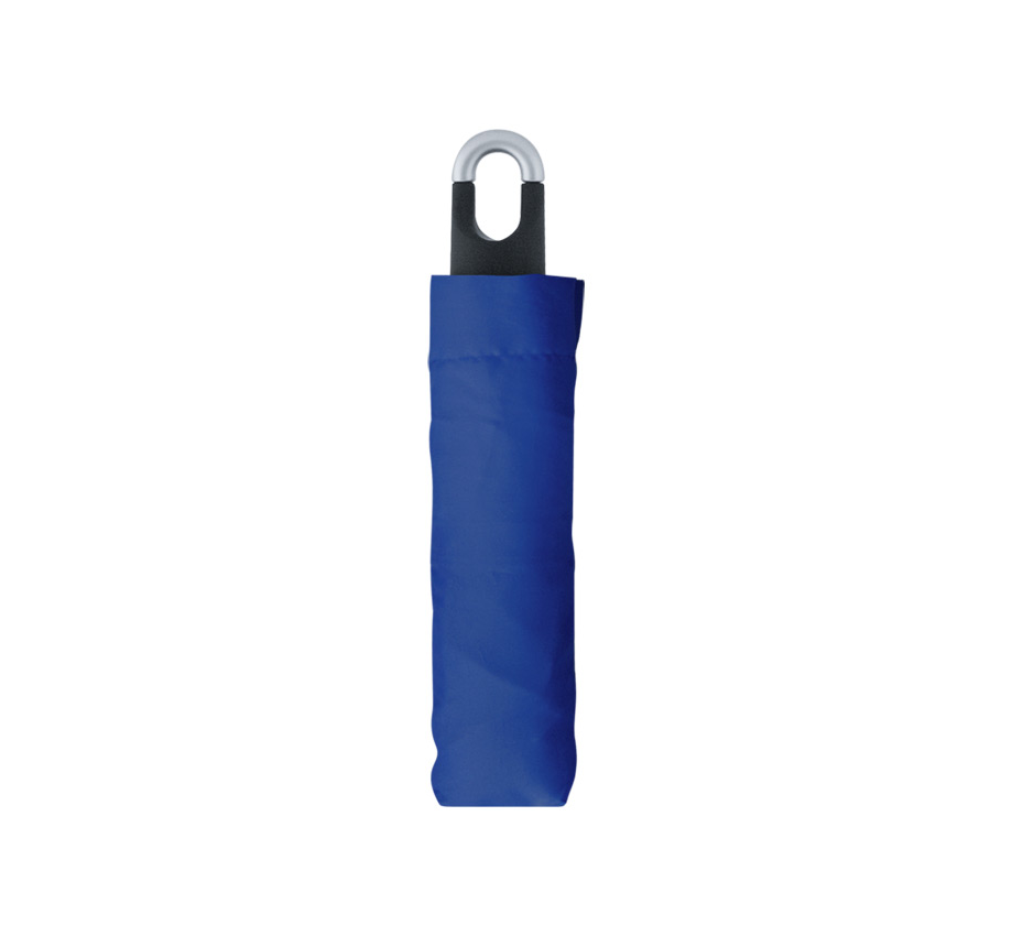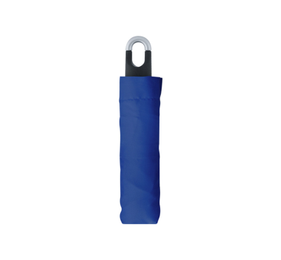 Foldable 8-panel umbrella with plastic carabiner handle, metal shaft and rib, and manual opening.