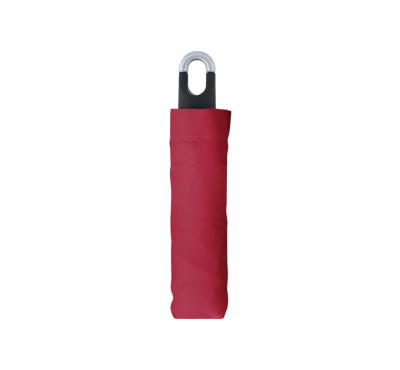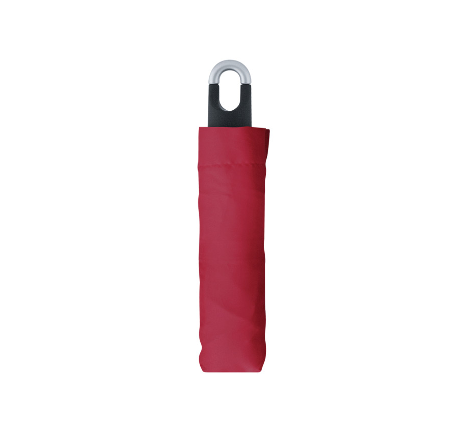 Foldable 8-panel umbrella with plastic carabiner handle, metal shaft and rib, and manual opening.