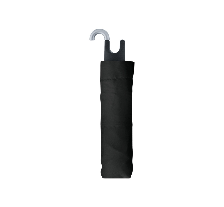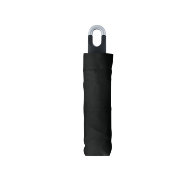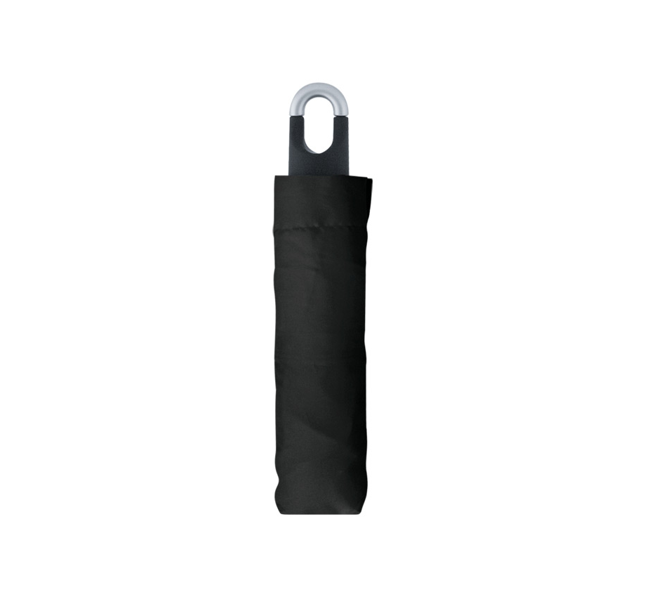 Foldable 8-panel umbrella with plastic carabiner handle, metal shaft and rib, and manual opening.