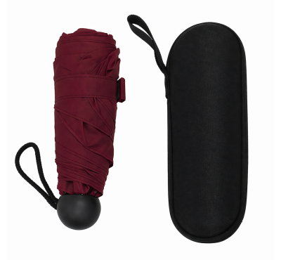 Мини сгъваем чадър с калъф, ръчен (отваряне/затваряне), 6 панелен, метална конструкция, пластмасова дръжка.