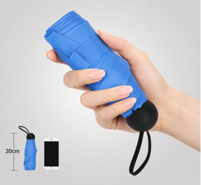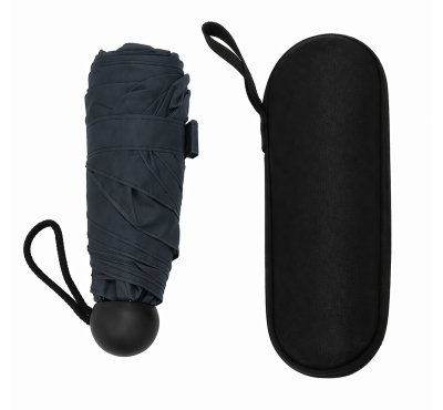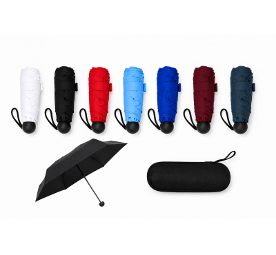 Мини сгъваем чадър с калъф, ръчен (отваряне/затваряне), 6 панелен, метална конструкция, пластмасова дръжка.