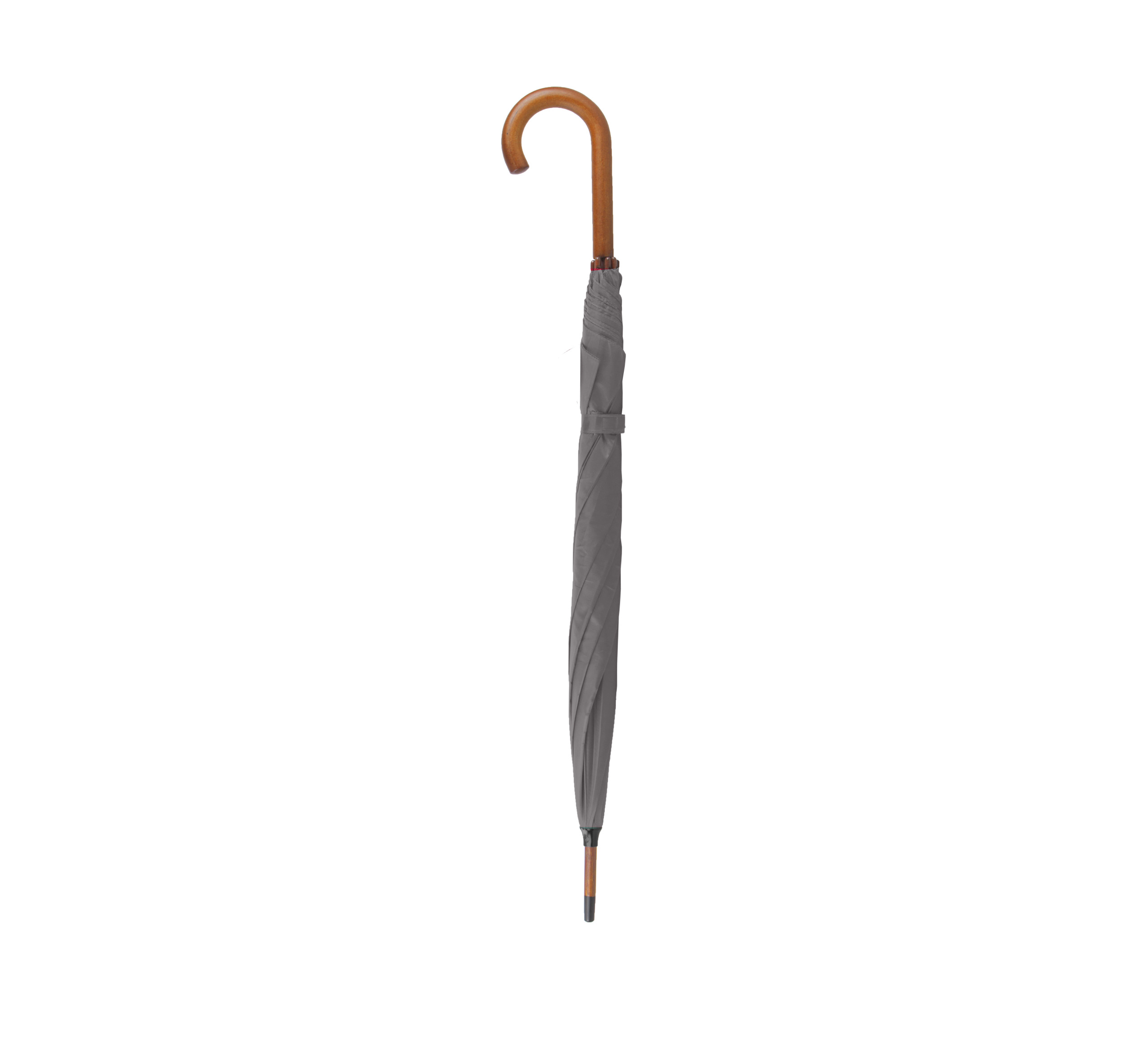 8-panel umbrella with wooden curved handle, wooden shaft, and automatic opening.