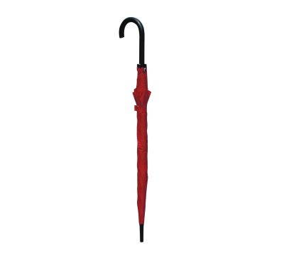 8-panel umbrella with plastic curved handle, metal shaft and ribs, and automatic opening.
