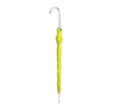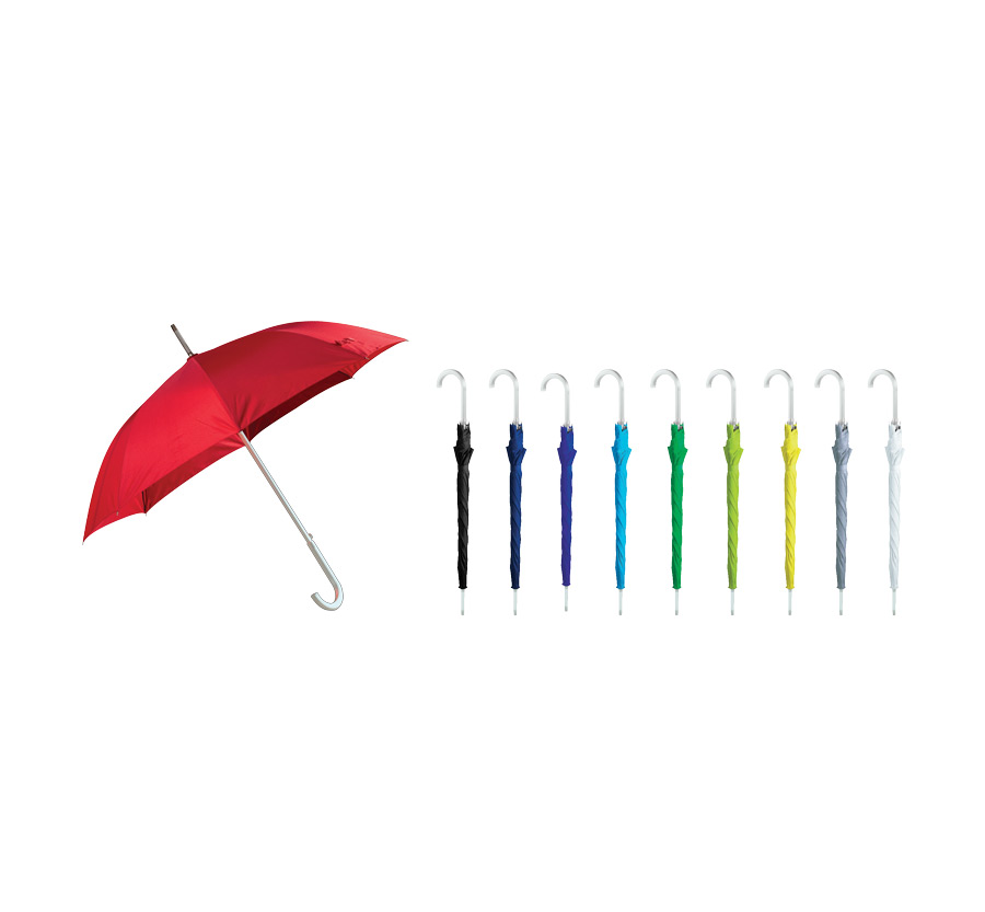 8-panel umbrella with aluminium curved handle, metal shaft and ribs, and automatic opening.