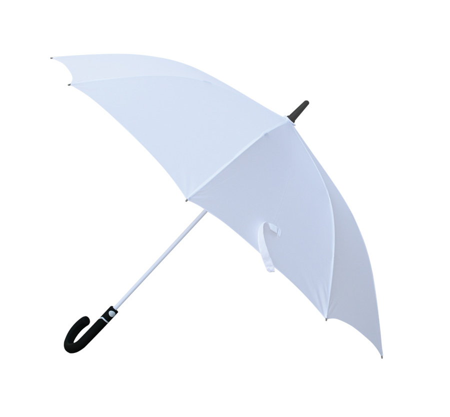 8-panel umbrella with rubberized plastic curved handle, fiberglass shaft and ribs, and automatic opening.