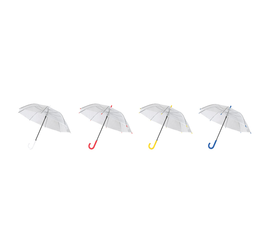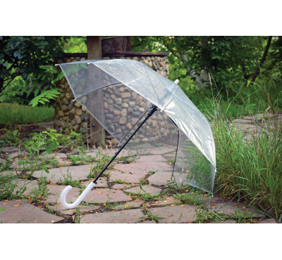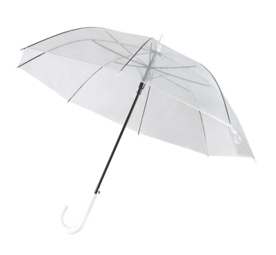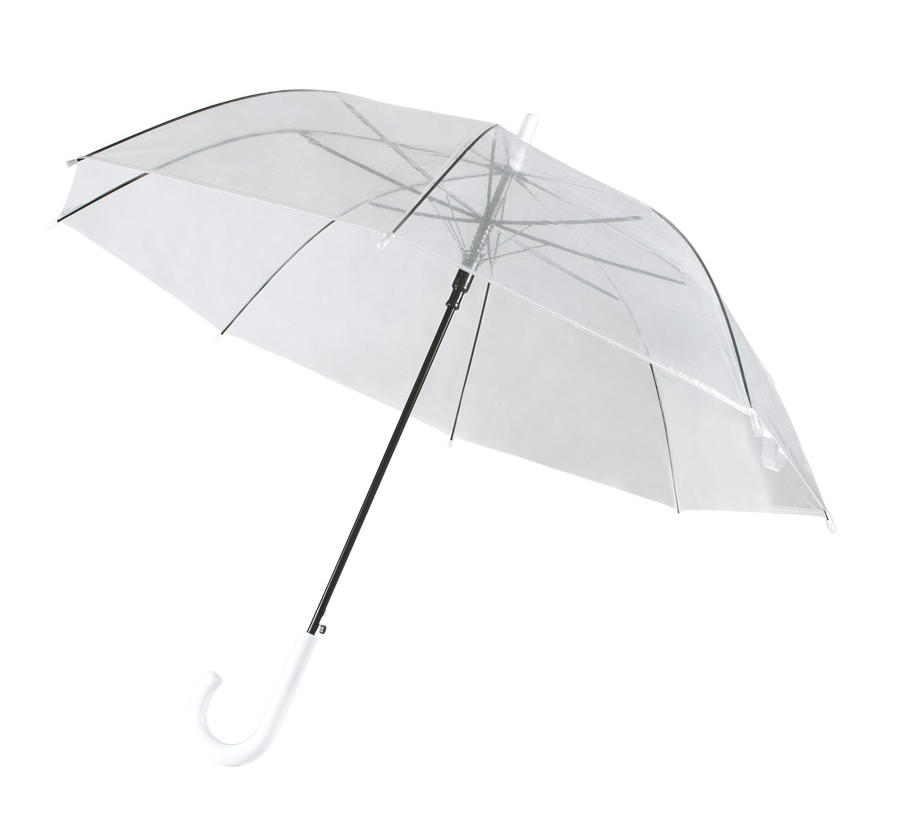 8-panel umbrella with plastic curved handle, fiberglass shaft and ribs, and automatic opening.