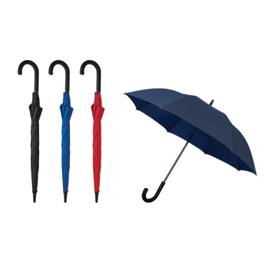 8-panel umbrella with plastic curved handle, fiberglass shaft and ribs, and automatic opening.