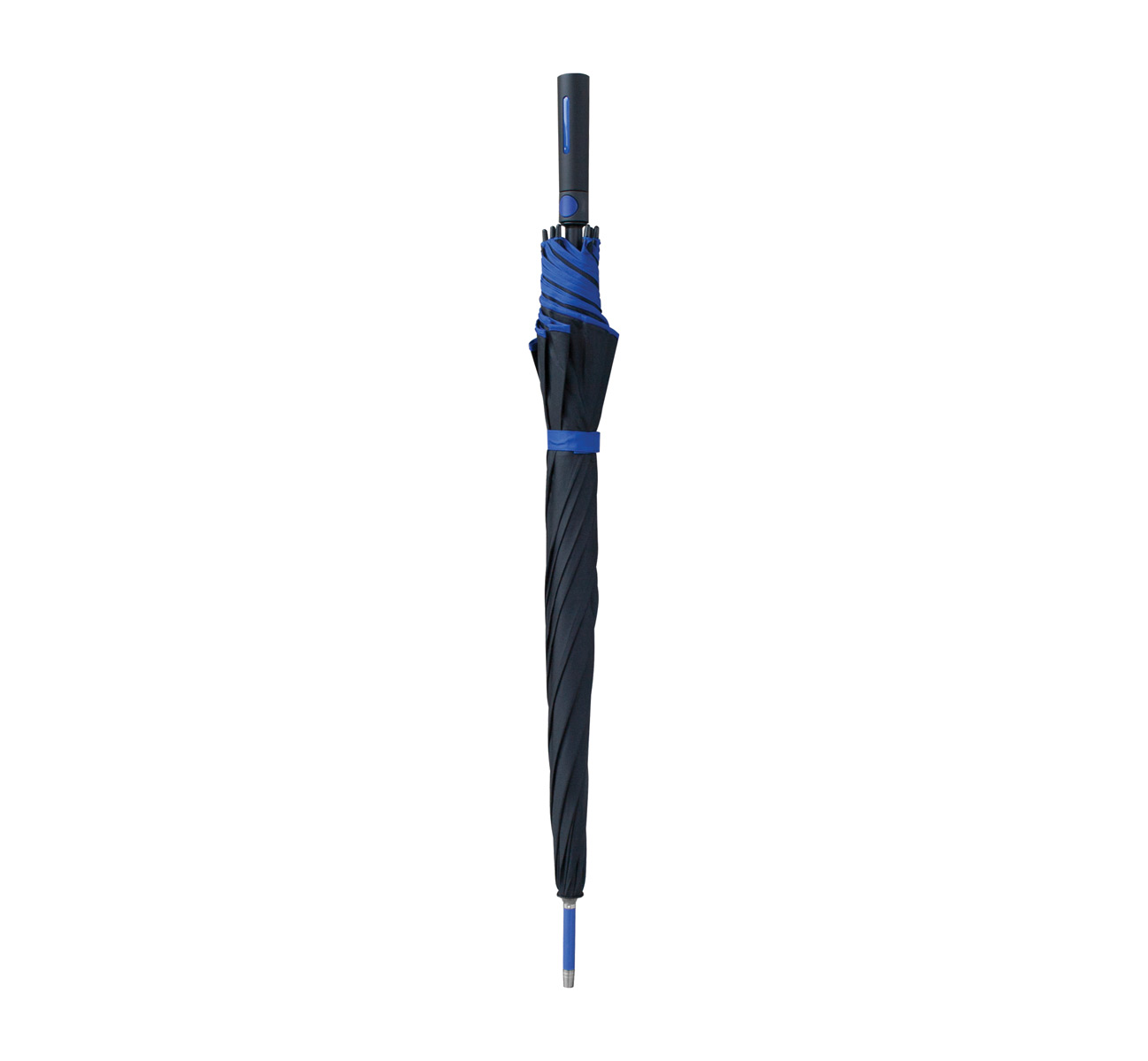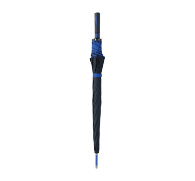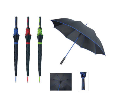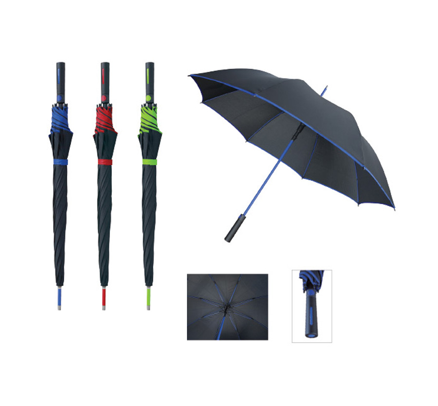 8-panel golf umbrella with plastic handle, fiberglass shaft and ribs, and automatic opening.