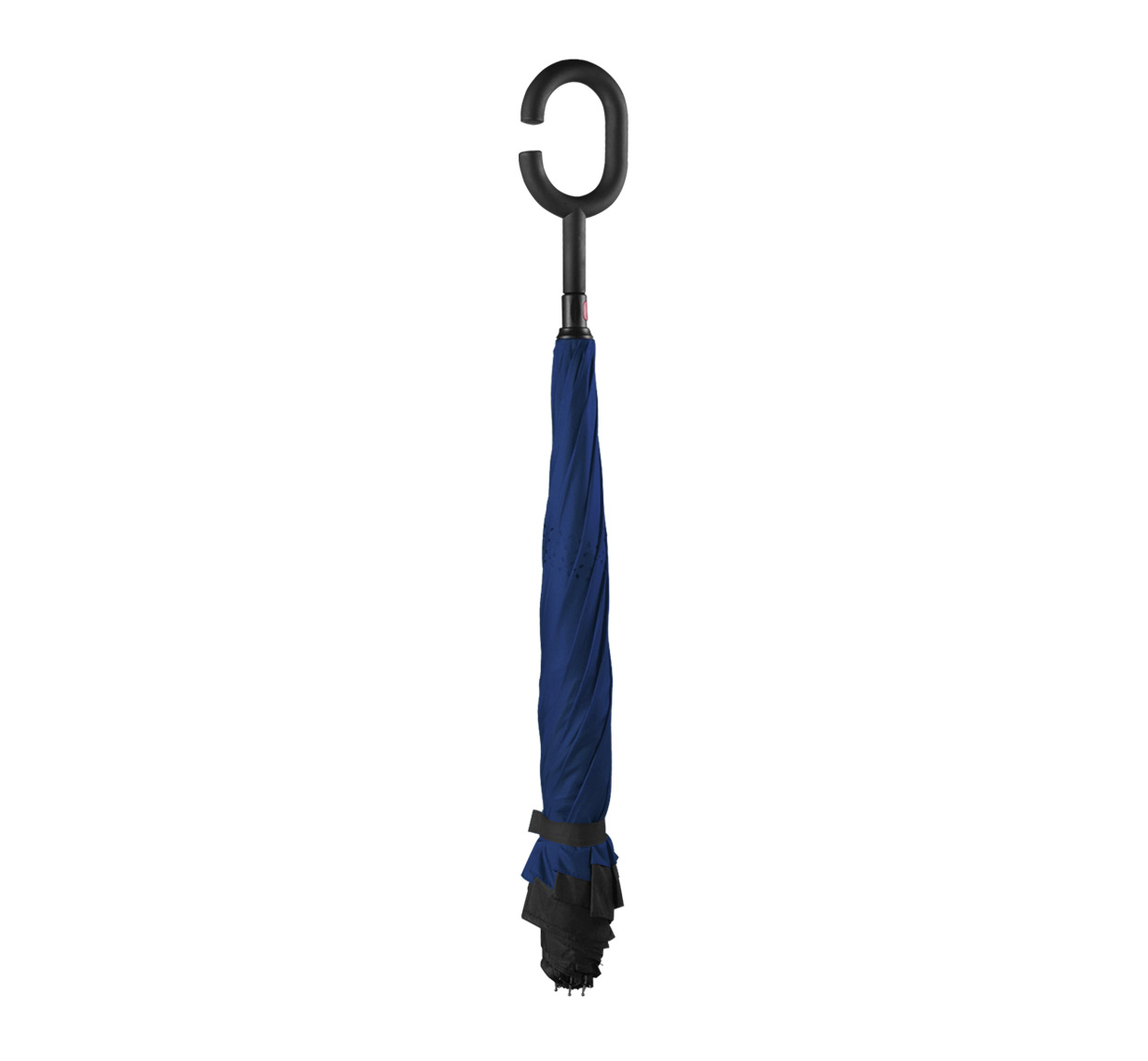 Reversible 8-panel umbrella with C-shape rubberized plastic handle, windproof system, manual opening, and dual layer polyester canopy.