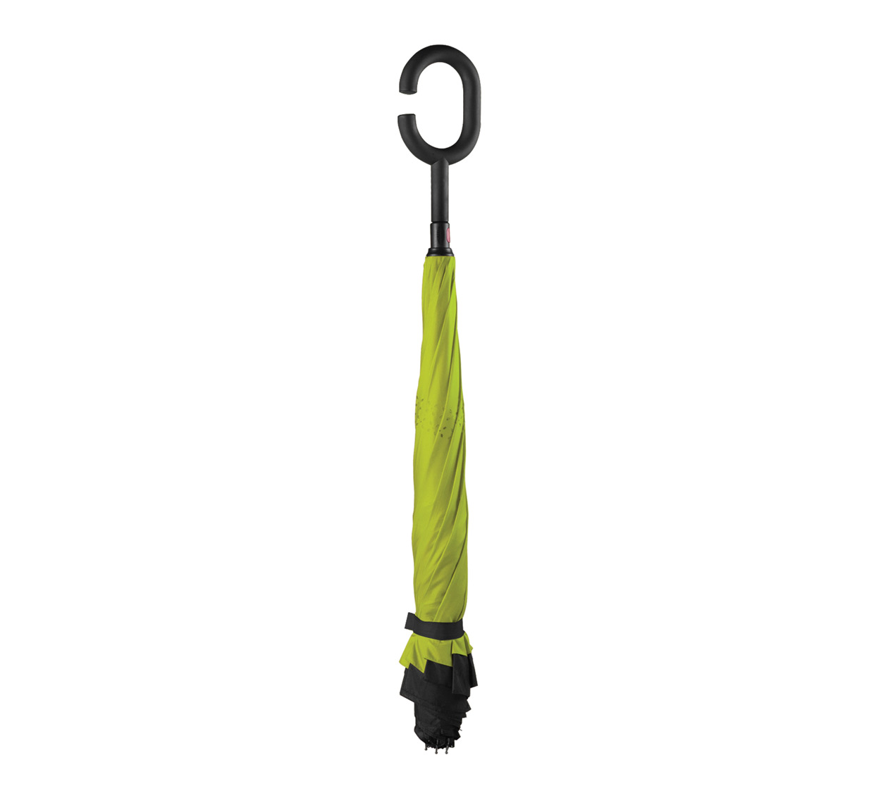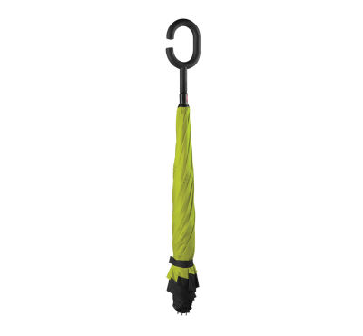 Reversible 8-panel umbrella with C-shape rubberized plastic handle, windproof system, manual opening, and dual layer polyester canopy.