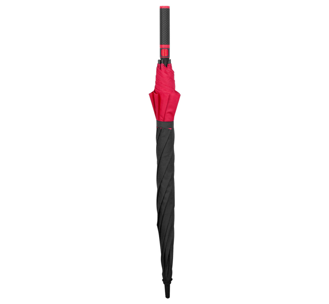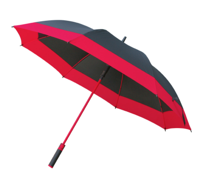 8-panel umbrella with plastic handle, fiberglass shaft and rib, and automatic opening.