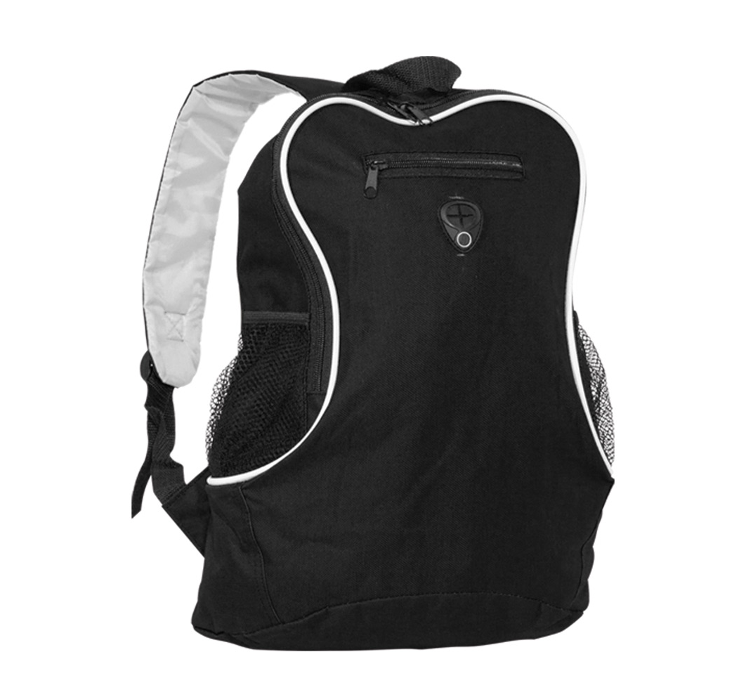 and side mesh pockets, adjustable padded shoulder straps, reinforced reinforced top carry handle.