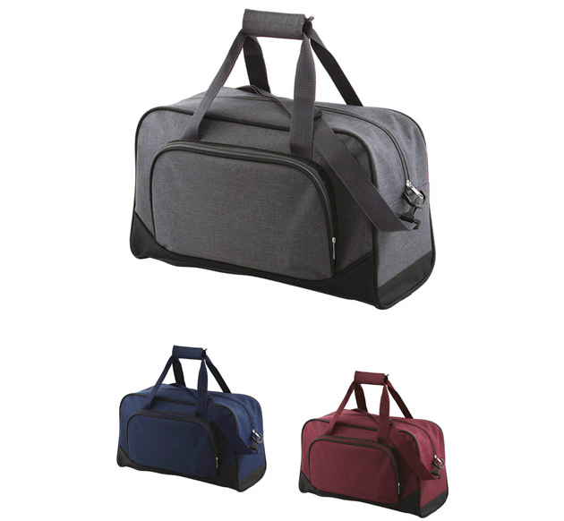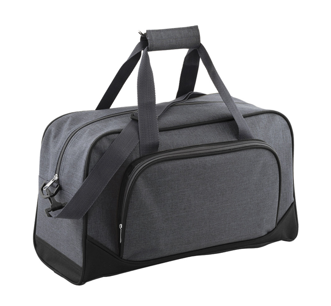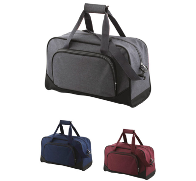 Polyester travel duffel bag with one main compartment, and front zipper pocket, adjustable strap.