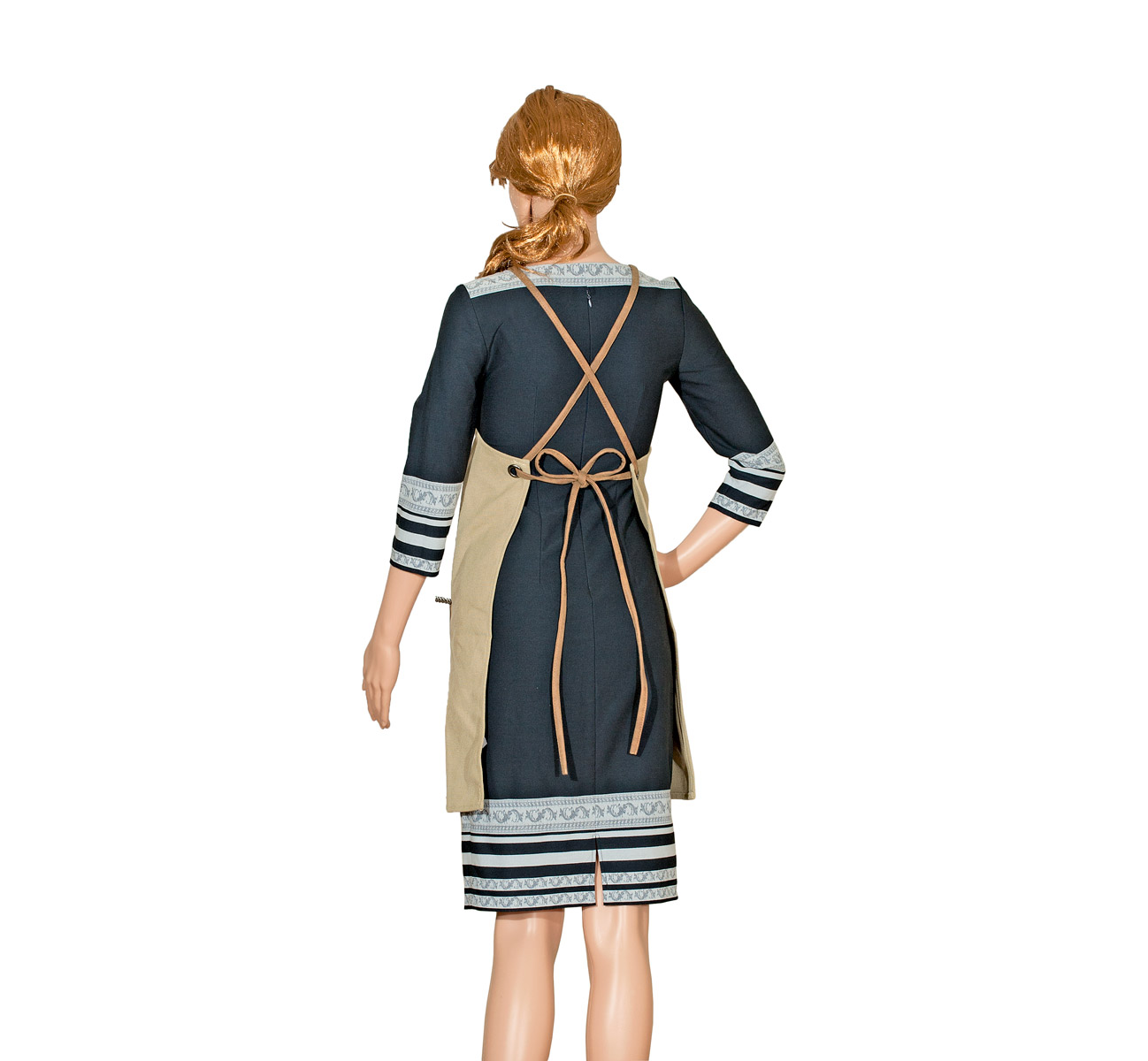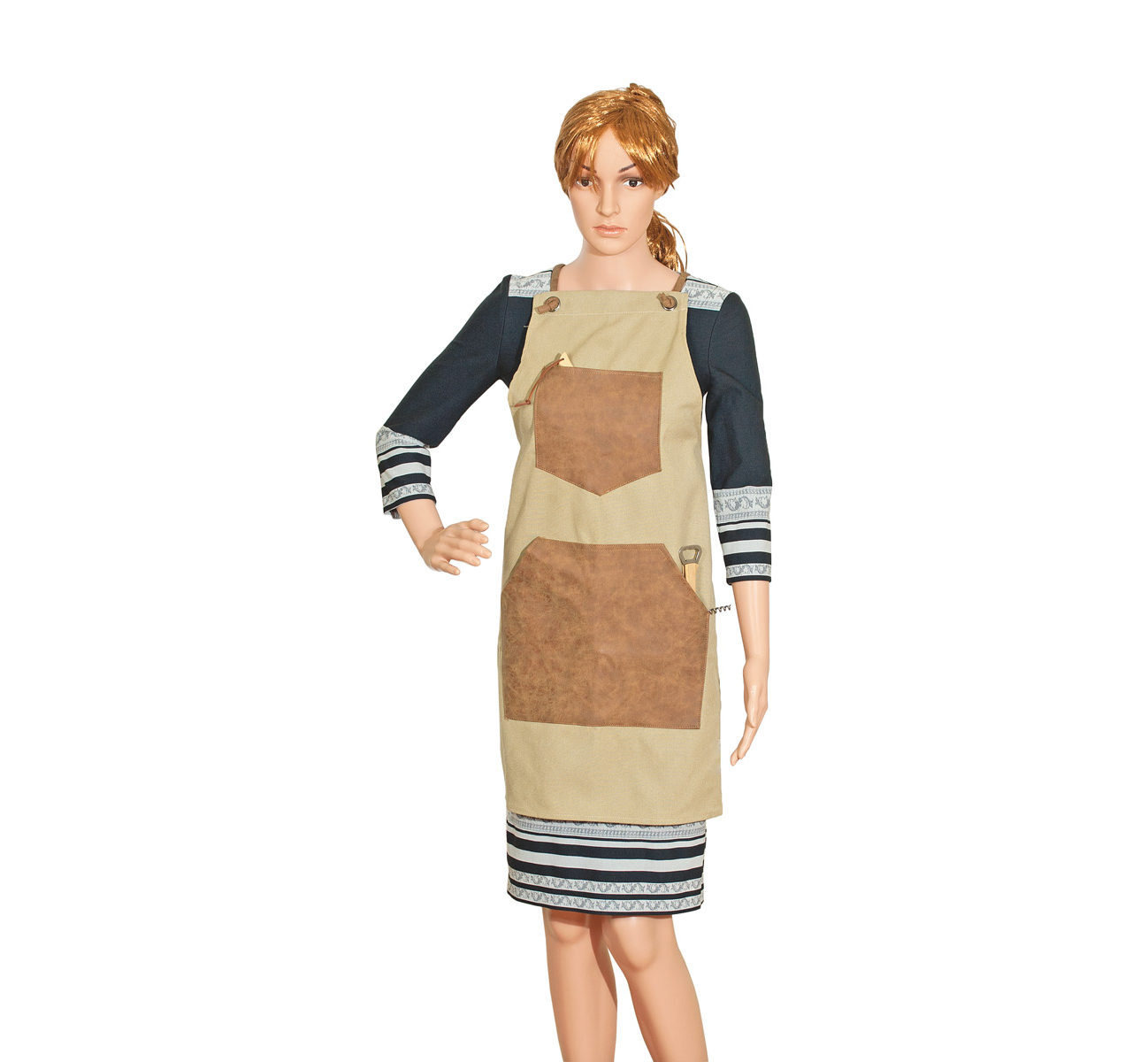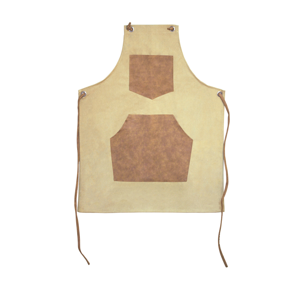 Canvas apron with PU, tie-back closure and front pockets.