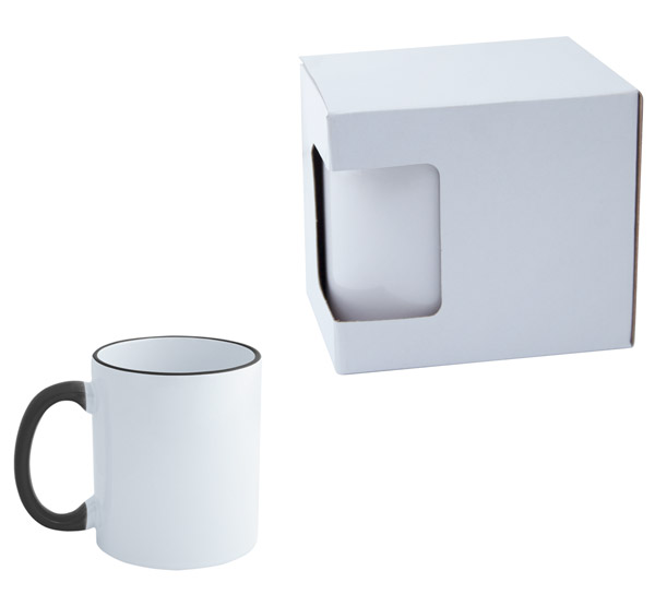 Classic design ceramic mug with colored rim and handle. Supplied in a white gift box.