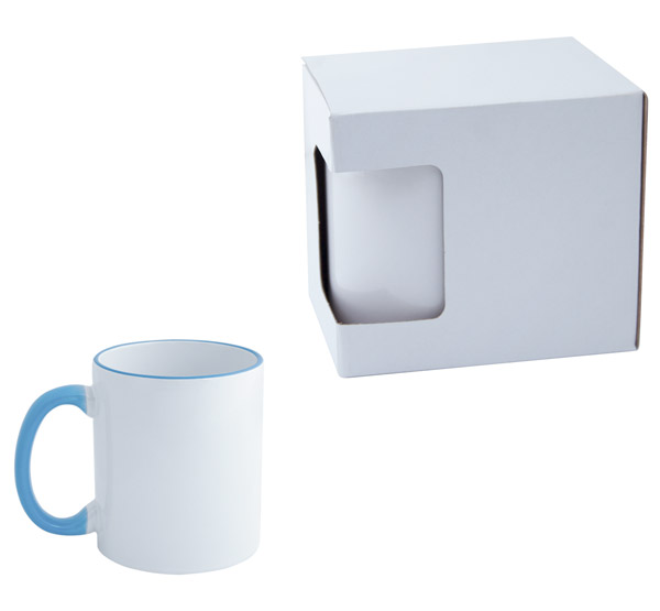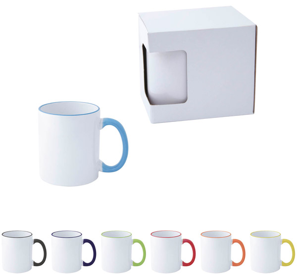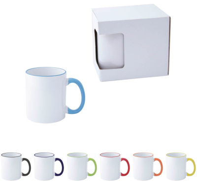 Classic design ceramic mug with colored rim and handle. Supplied in a white gift box.