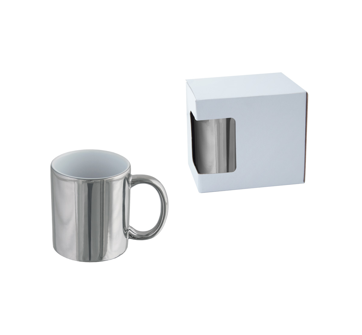 Classic design ceramic mug with a gold/silver shiny finish. Supplied in a white gift box.