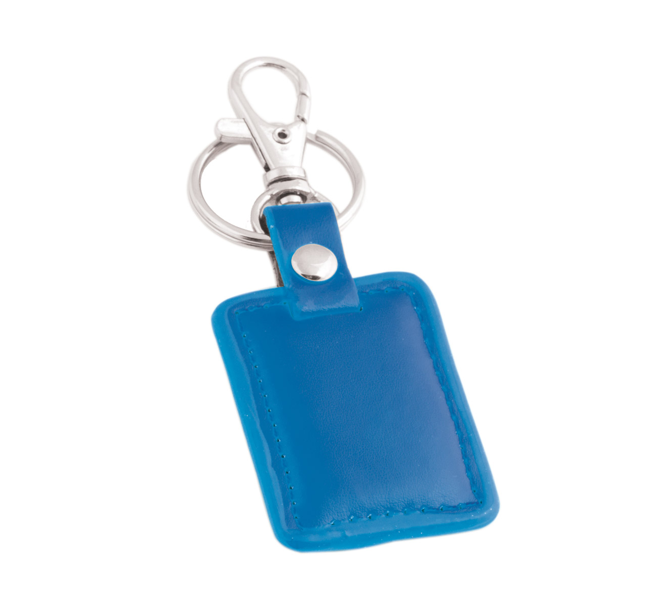 Leather-look rectangular keychain with metal hook and split keyring.