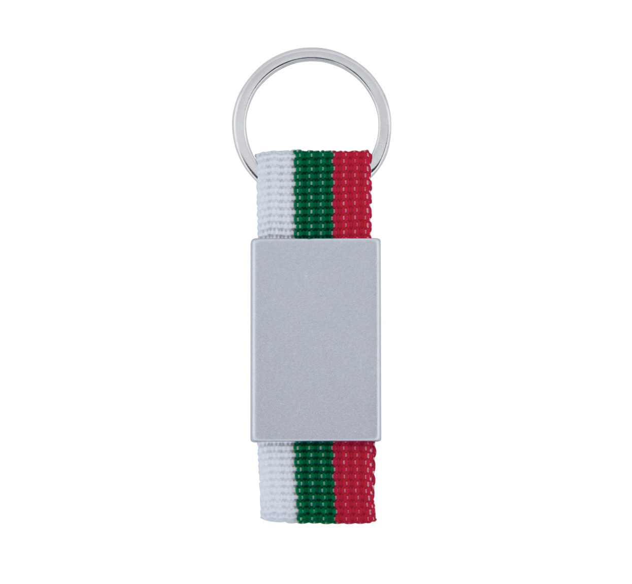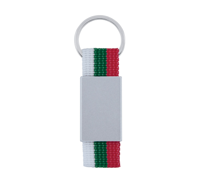 Metal rectangular keychain with Bulgarian country flag polyester webbing, and metal split keyring.