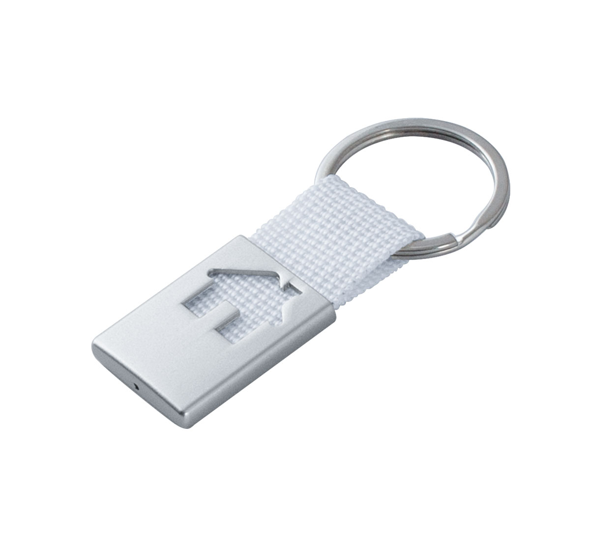 Metal rectangular keychain with house, black polyester webbing, and metal split keyring.