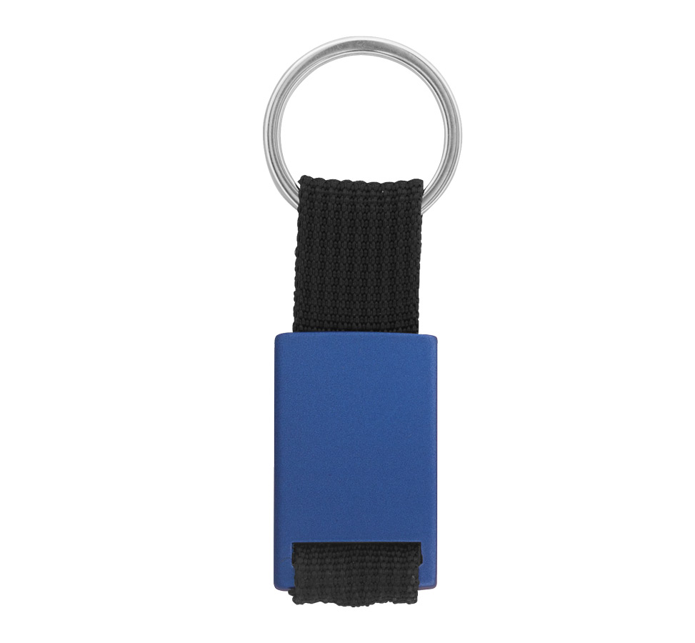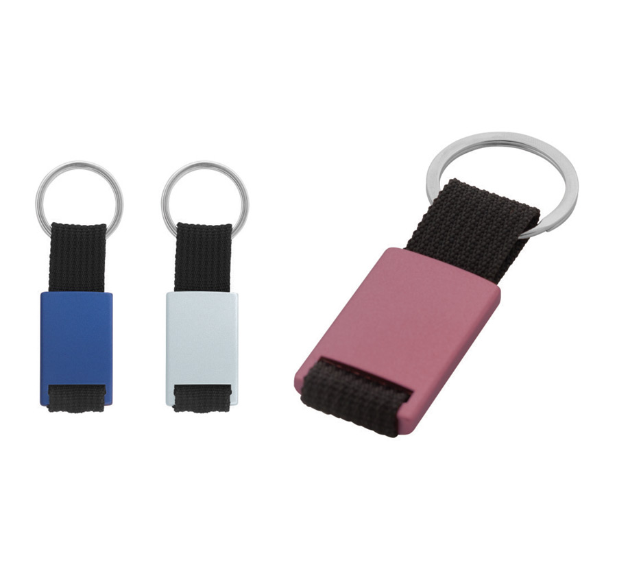 Metal rectangular keychain with black polyester webbing, and metal split keyring.