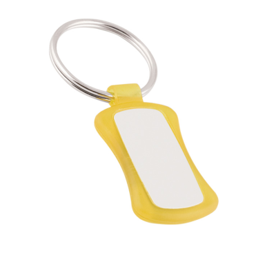 Plastic keychain with metal split keyring and aluminium plate.