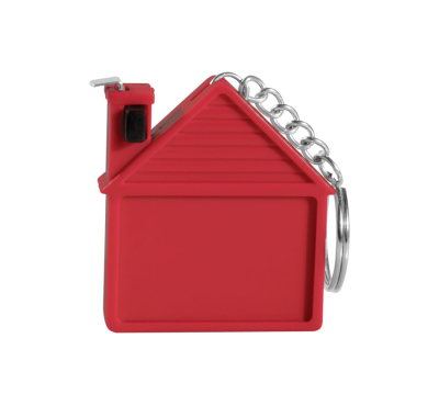 Plastic house shaped keychain with one metre measuring tape, and split keyring.