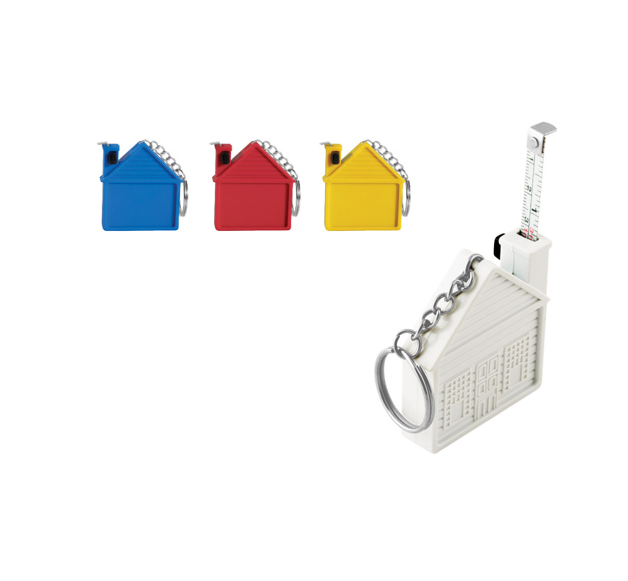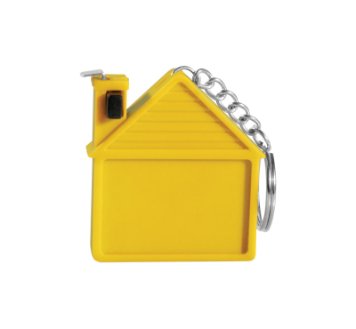 Plastic house shaped keychain with one metre measuring tape, and split keyring.