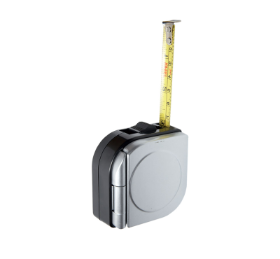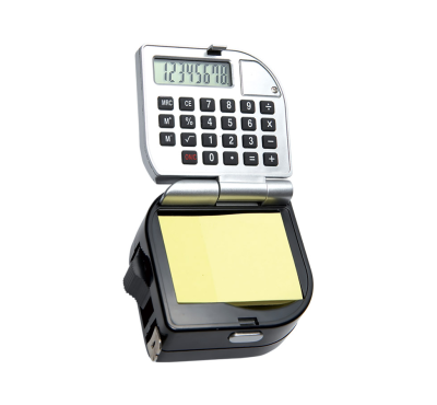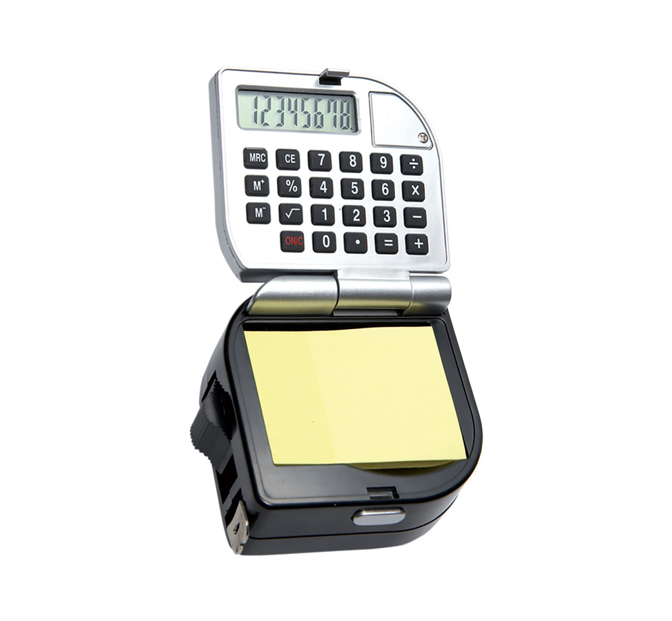3 metre plastic measuring tape with calculator, yellow sticky notes, and belt clip.