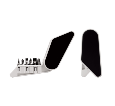 6-function screwdriver set. The compartment contains 3 sizes flathead and 3 sizes cross tip bits.