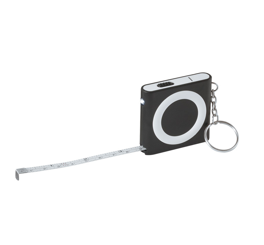 Plastic square keychain with torch, one metre measuring tape, and split keyring.
