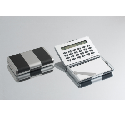Business card holder with calculator and magic closure, made of plastic and PU leather.