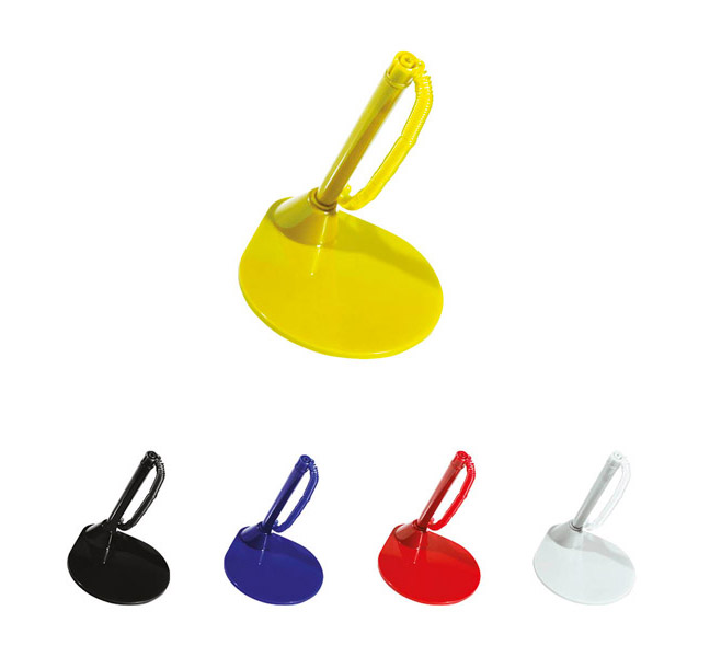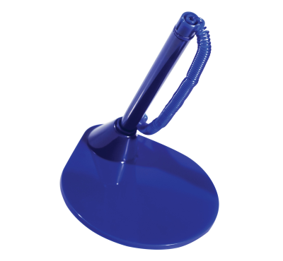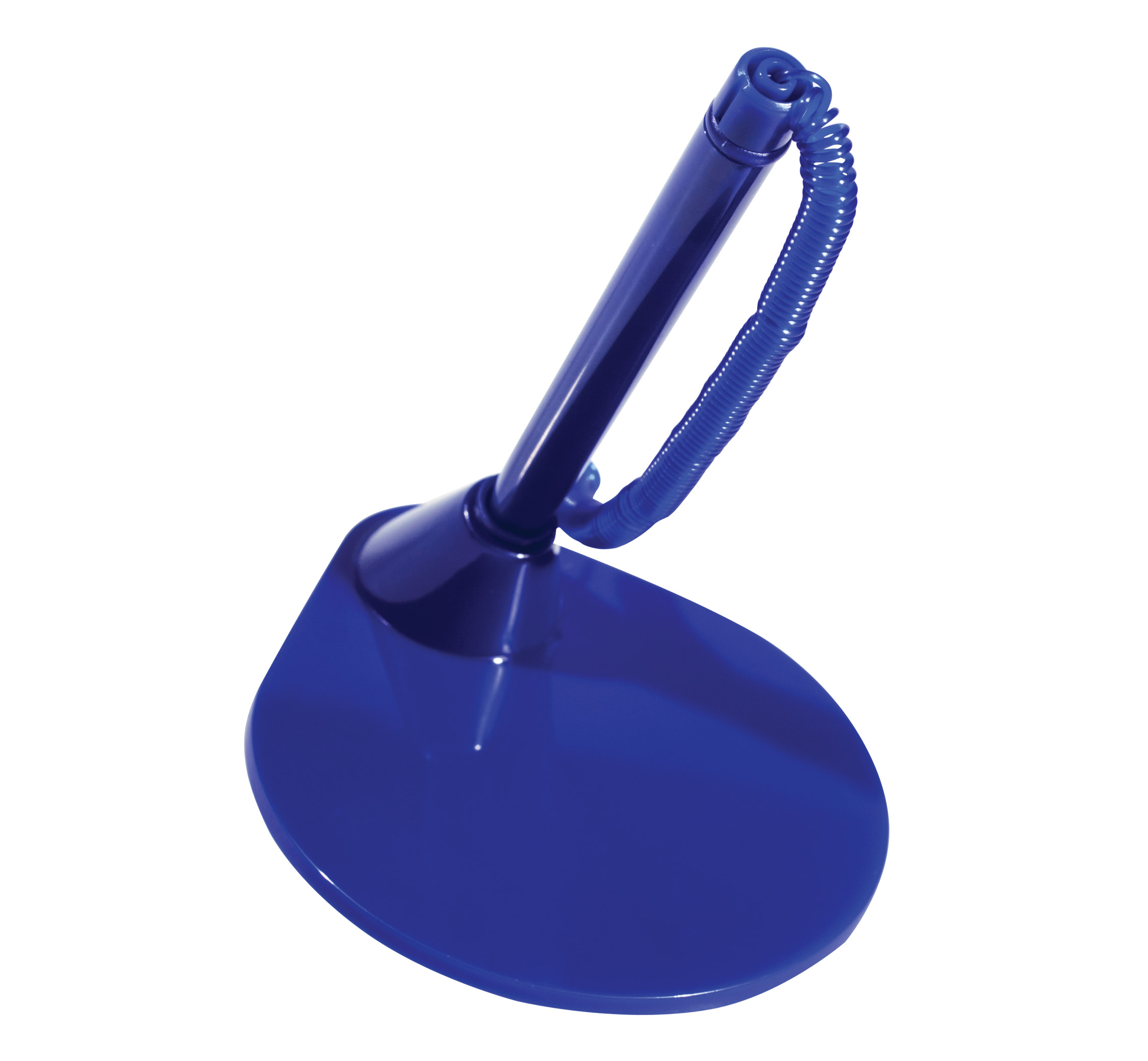 Plastic desktop pen with elastic cord and plastic base, blue ink.