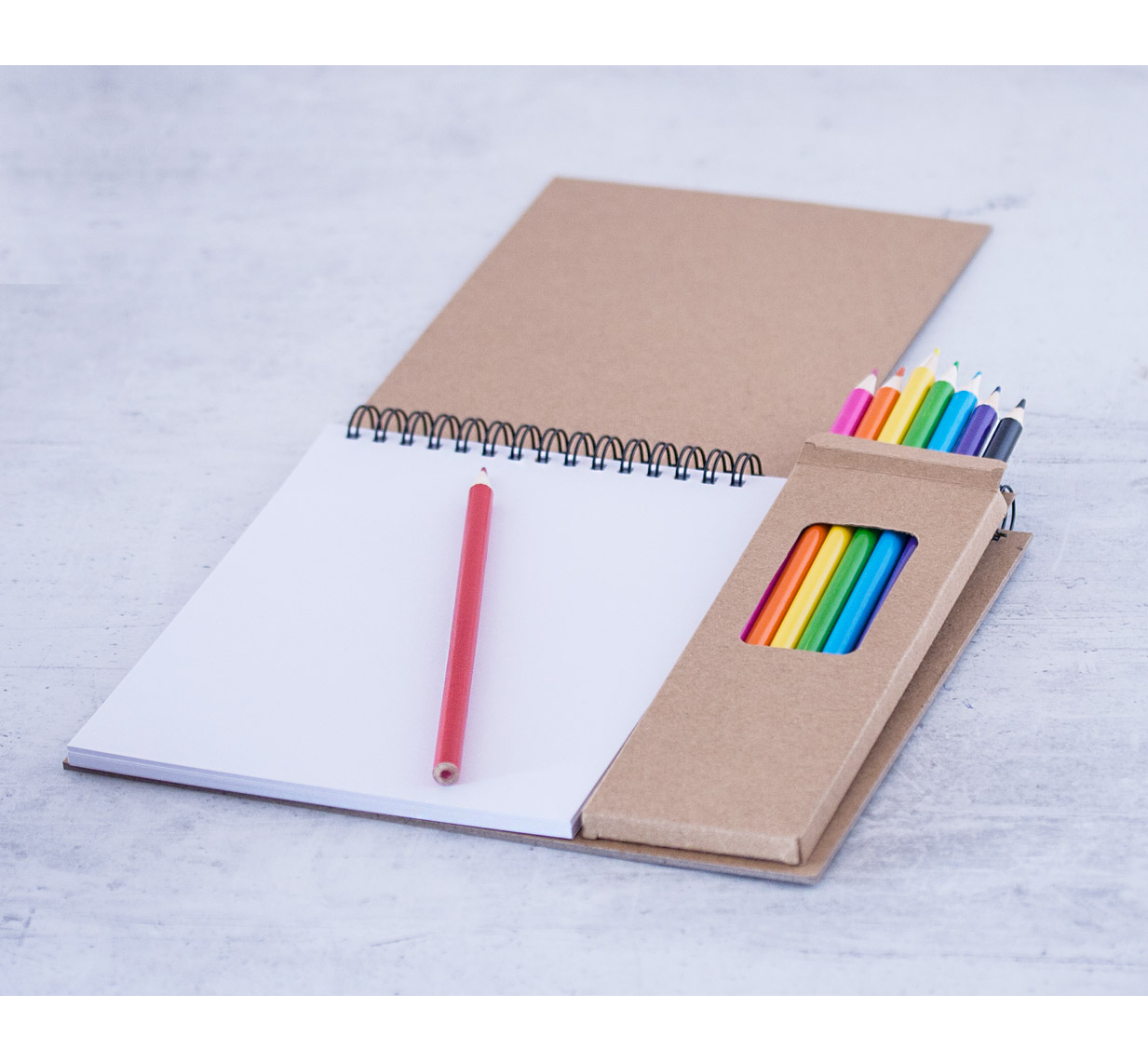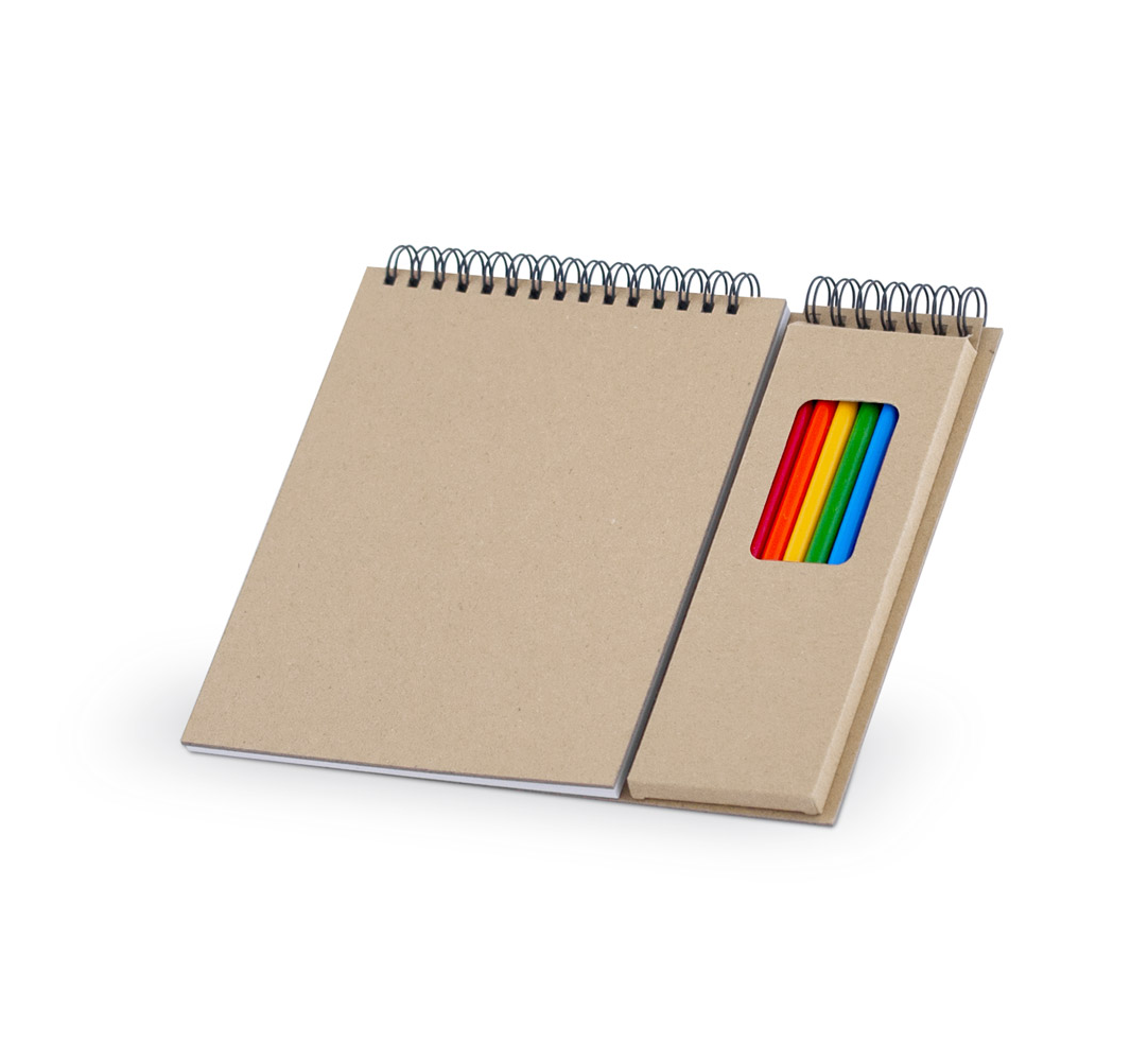 Еко тефтер с 8 цветни моливи, 50 листа без редове, цвят на хартията бял.