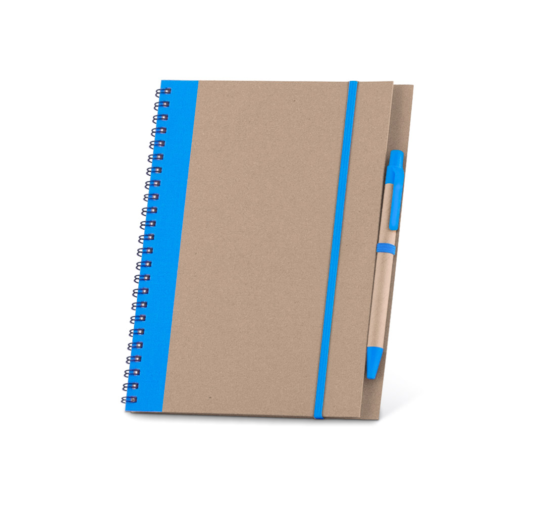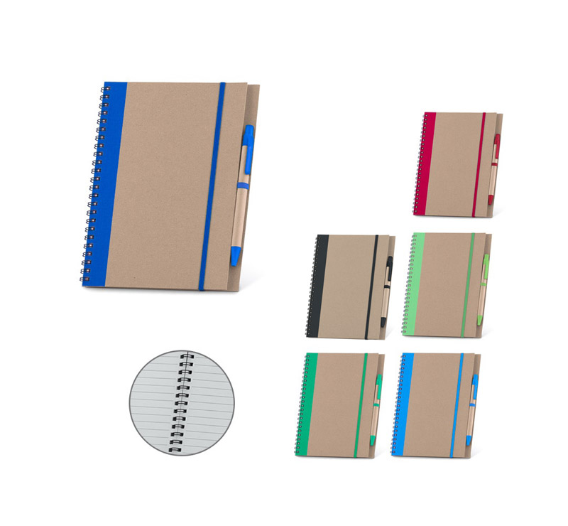 a matching coloured elastic closure, and a recycled paper ballpoint pen, blue ink.