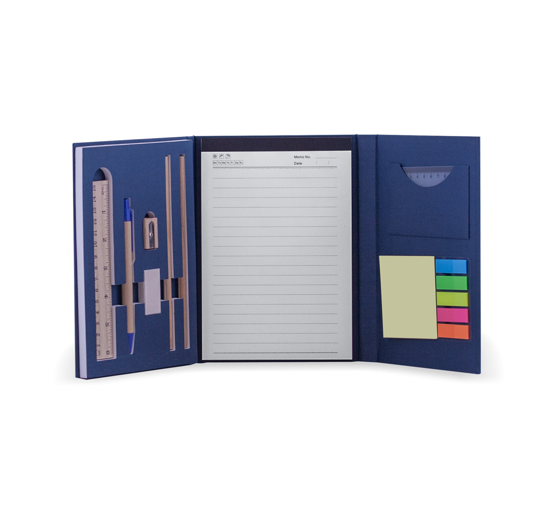 Еко тефтер с еко химикалка, моливи, линии, гума, острилка, 50 листа с редове, цвят на хартията слонова кост, самозалепващи листчета 6 цвята.