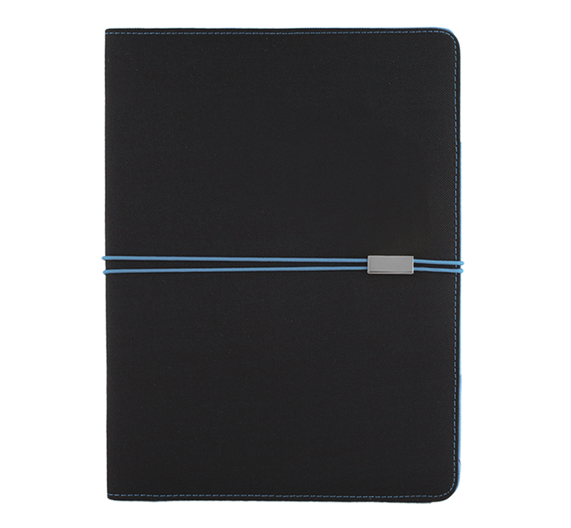 A4 Polyester document folder with elastic closure, and metal plate. Includes pen loop, inner document compartments,