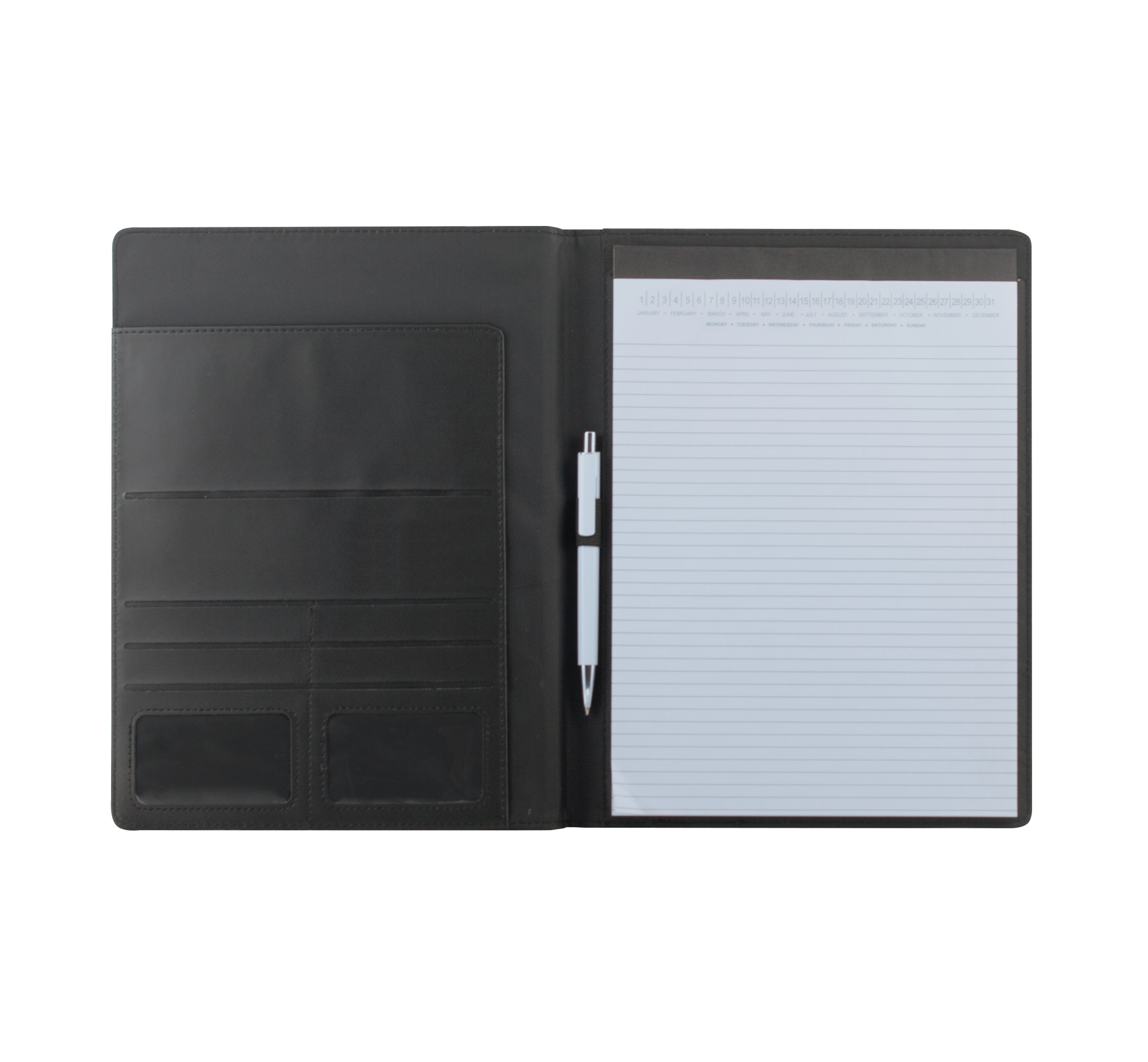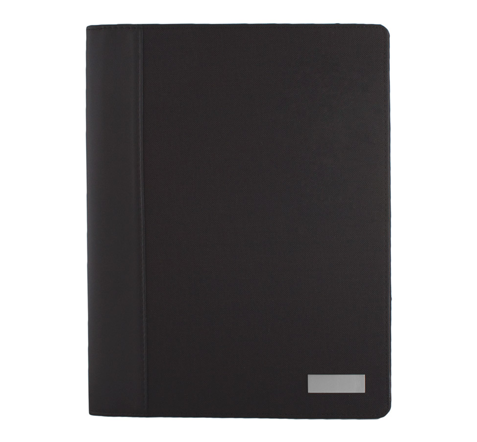 A4 PU leather and polyester document folder, includes pen loop, inner document compartments, and A4 20 sheets lined notepad.