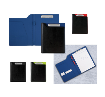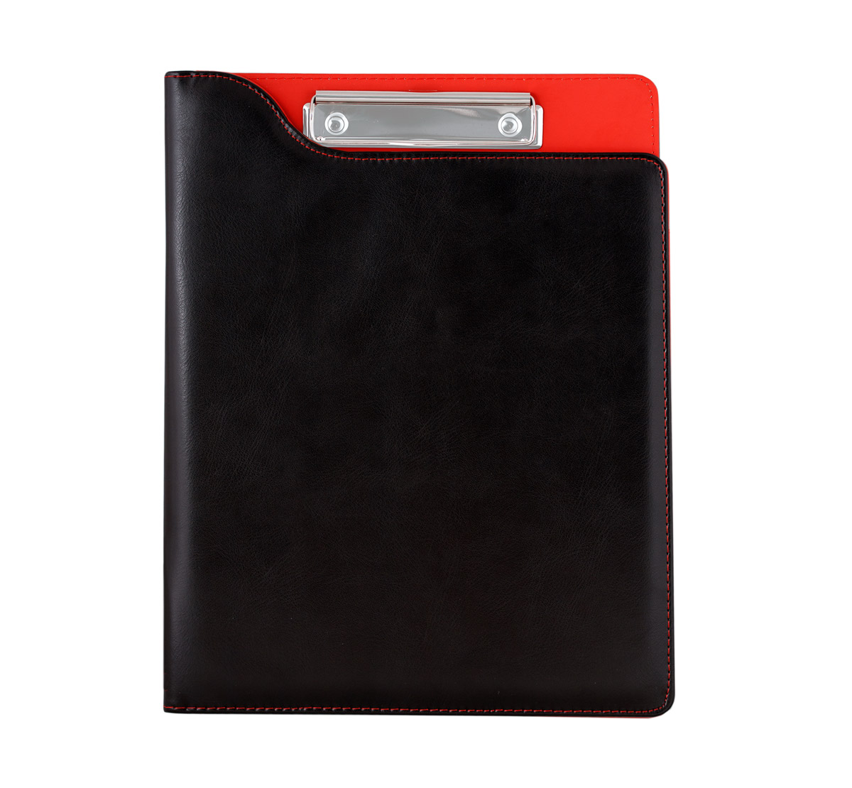 A4 PU leather clipboard with cover, includes pen loop, inner document compartments and business card slot.