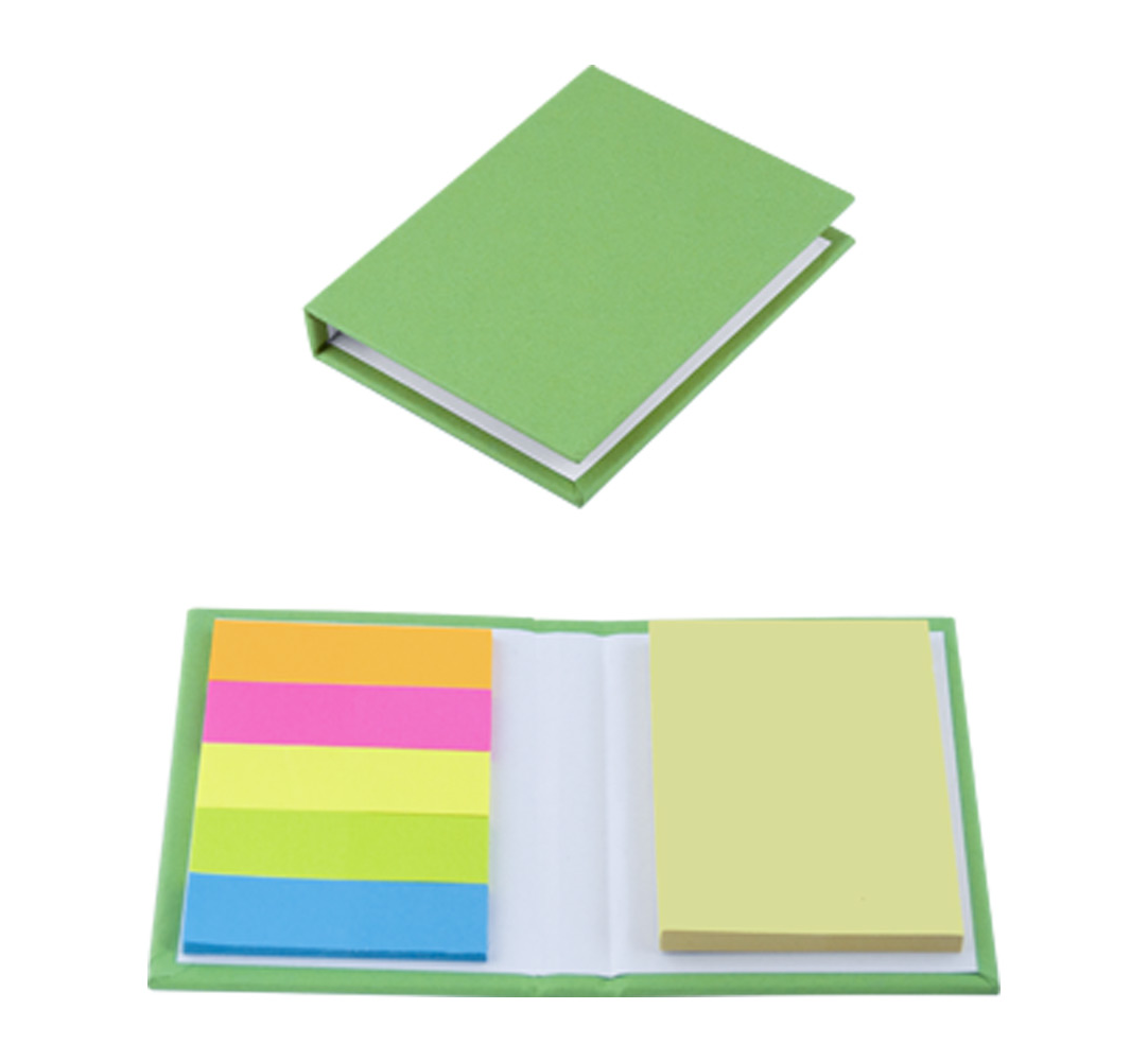 Recycled paper hardcover booklet includes sticky notes in 6 color.