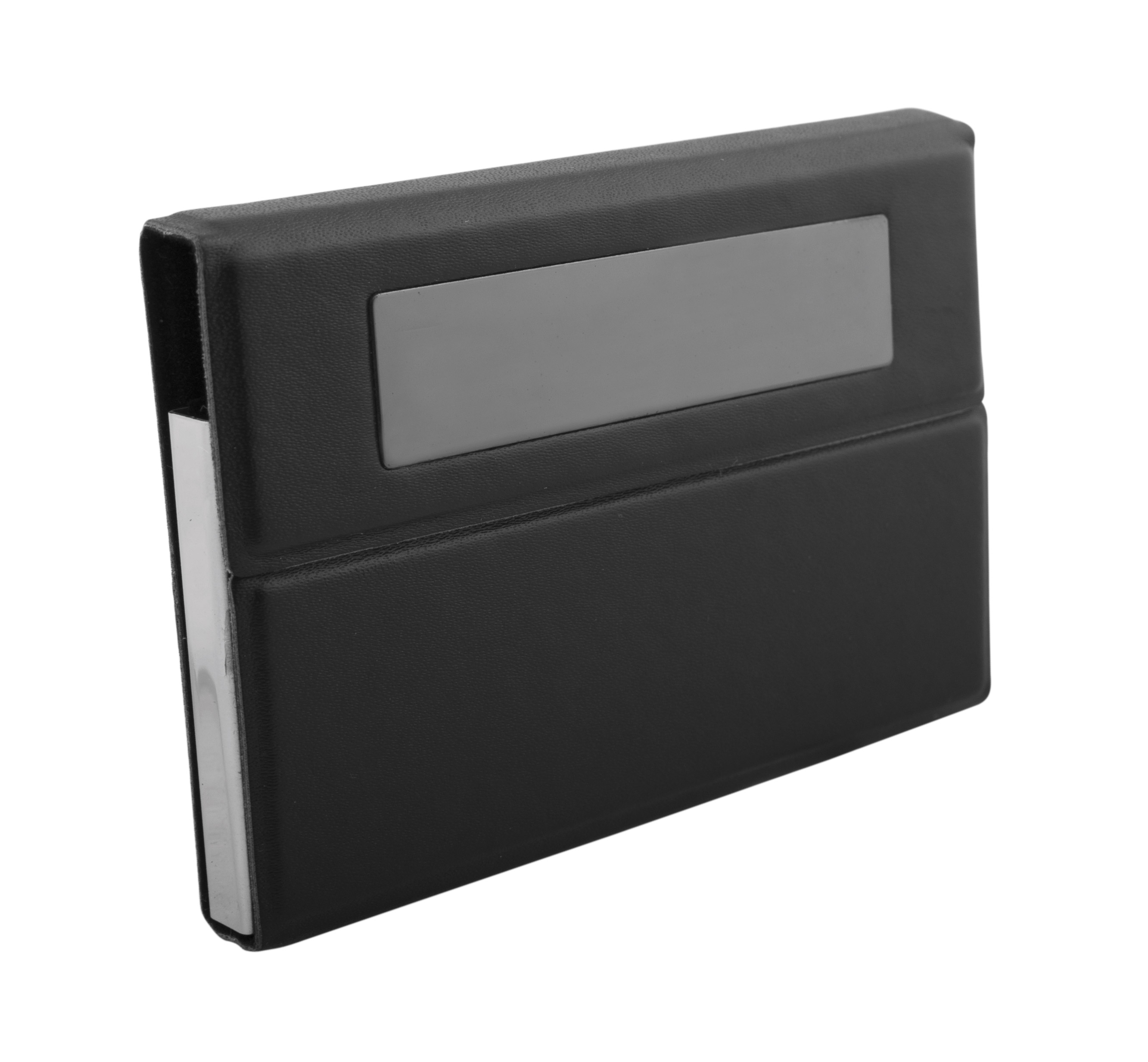 Business card holder with metal frame, PU leather cover, and metal plate.