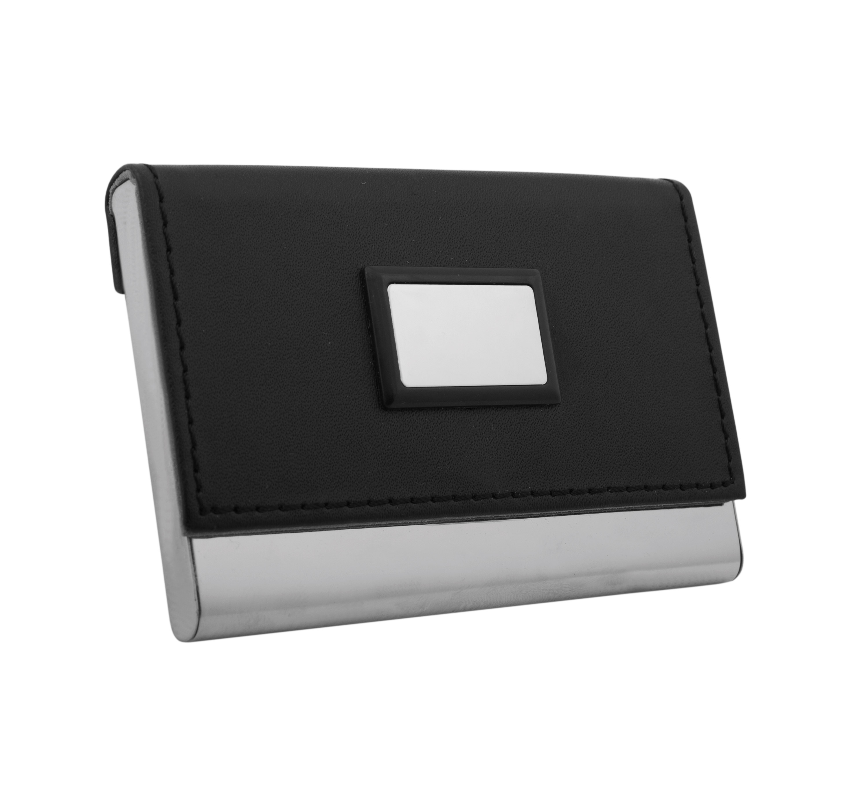 Business card holder with metal frame, PU leather cover, and metal plate.