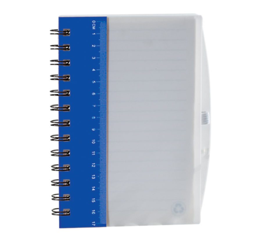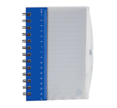 Plastic cover spiral notebook and ruler, includes 70 sheets of ivory-colored lined paper.
