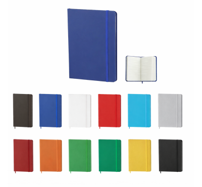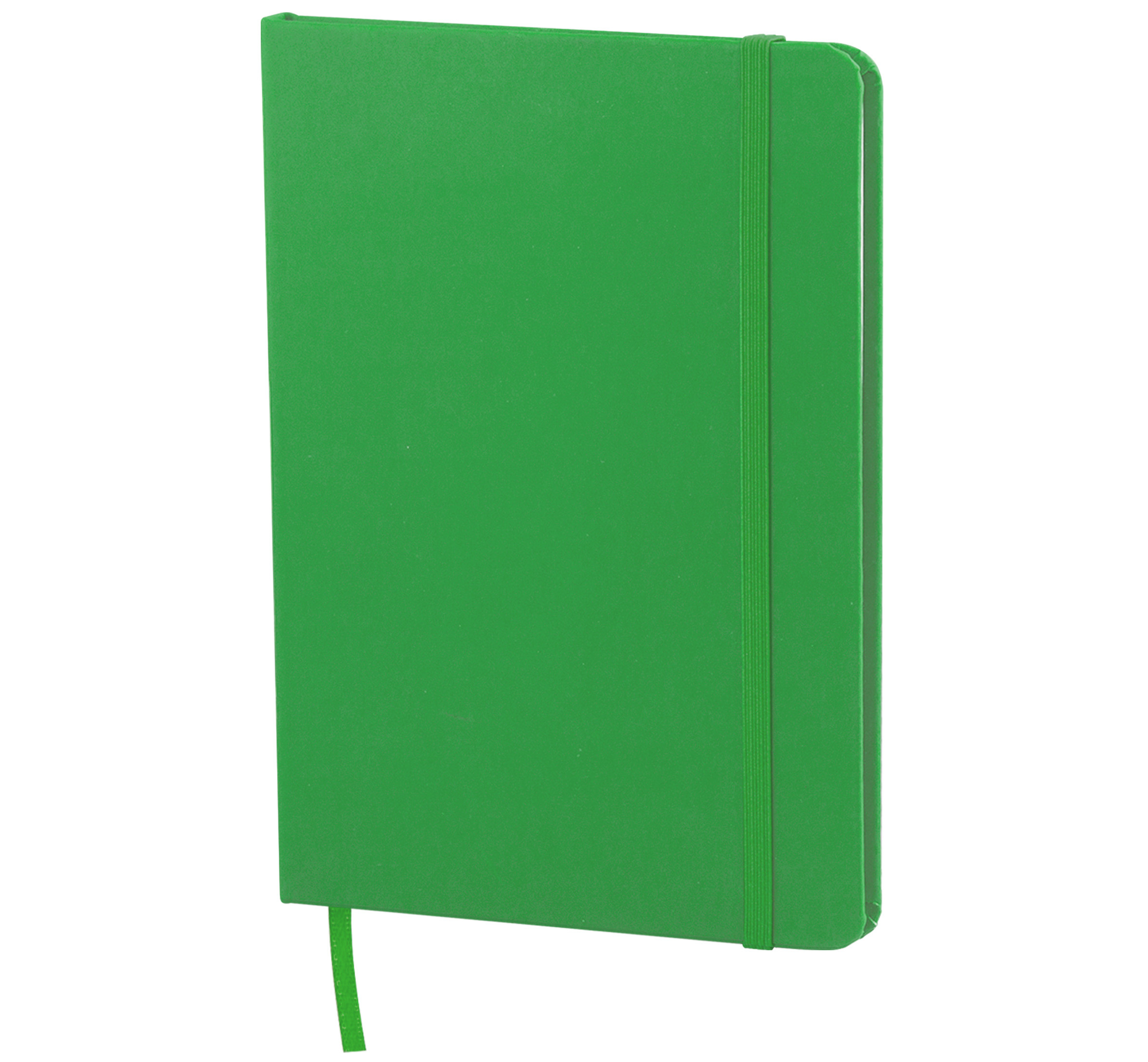 A5 Notebook with soft-feel PU cover, includes 80 sheets of ivory-colored lined paper, a matching coloured elastic closure and ribbon.