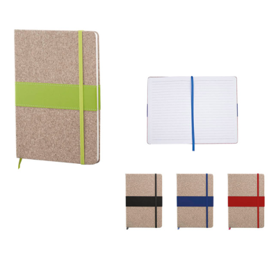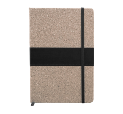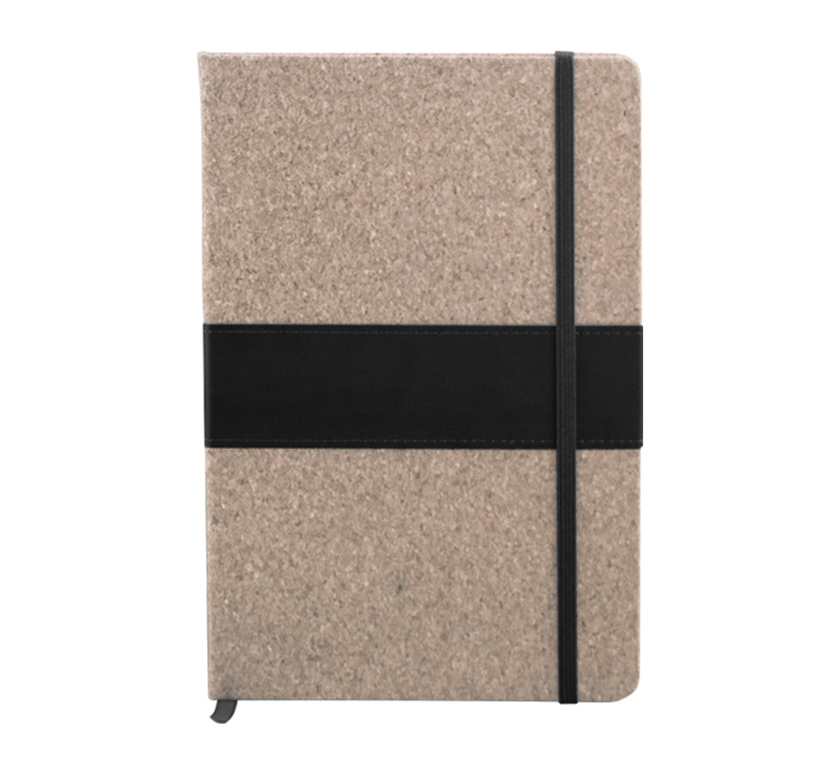 Тефтер A5 с коркови корици, ластик и разделител, 80 листа с редове, цвят на хартията слонова кост, твърда корица.