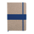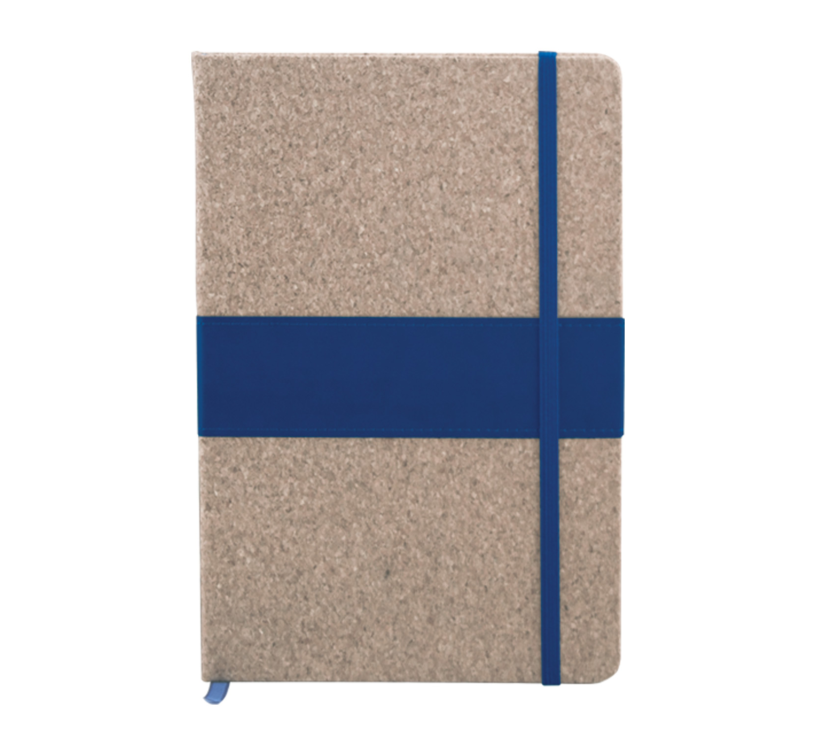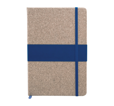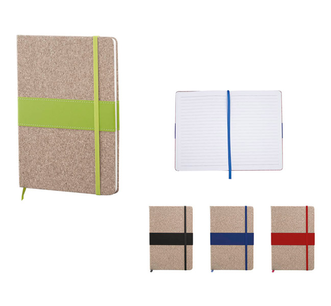 A5 Notebook with natural cork hardcover and leather-look side, includes 80 sheets of ivory-colored lined paper, a matching coloured elastic closure, and ribbon.