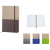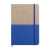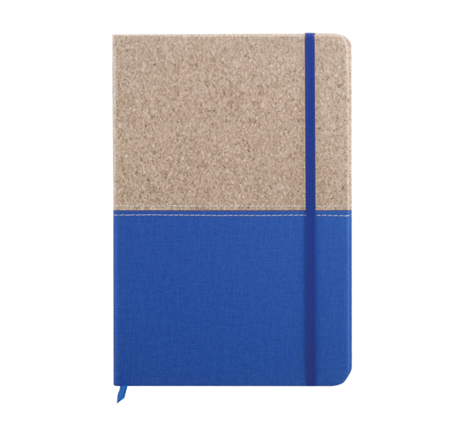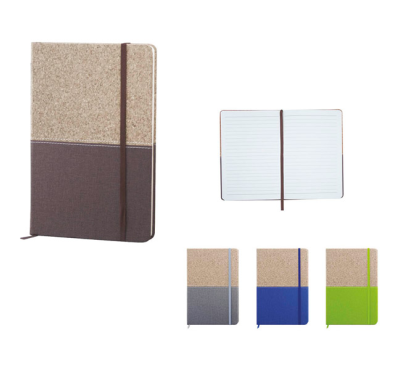 A5 Notebook with natural cork hardcover and fabric lower part, includes 80 sheets of ivory-colored lined paper, a matching coloured elastic closure, and ribbon.