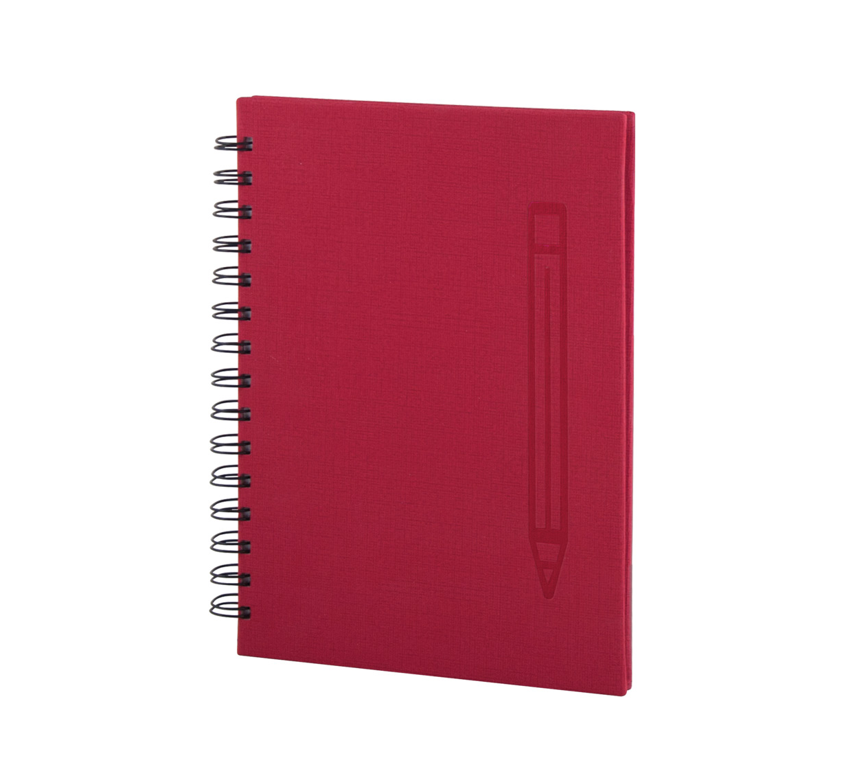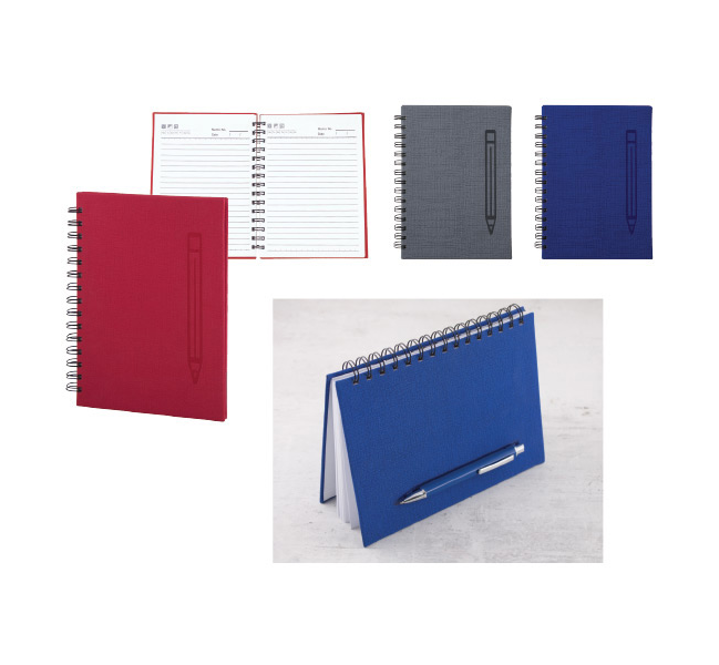A5 spiral notebook with hardcover and built-in magnet for pen, includes 70 sheets of white-lined paper.